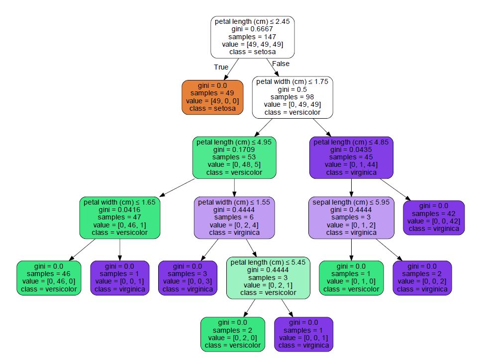 In this post, we’ll be working with the Iris data set (the Wikipedia page has a lot of information, including all of the data) - this is a real data set and a classic machine learning problem. This data set is also known as Fisher’s Iris data set and Anderson’s Iris data set. The data set is a total of 150 samples of different species of Iris – 50 samples each for Iris setosa, Iris virginica, and Iris versicolor, each of these are pictured above. For each sample, researchers collected the length and width of the sepals and petals (so, 4 measurements per sample). Our goals will be similar to our last post. We want to import the data set into Python, Train a classifier, Predict the flower based on new measurements, and finally, Visualize the tree.